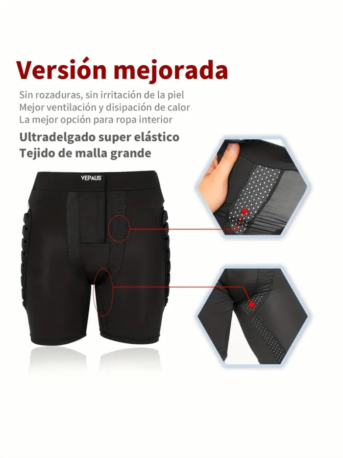 Calzas cortas deportivas con protecciones integradas, diseñadas para brindar seguridad y comodidad en cada movimiento. Incorporan un refuerzo grande en la zona lumbar, coxis y isquiones, ideal para absorber impactos en la espalda baja. Además, cuentan con protecciones laterales en cada femoral y en la parte frontal de ambos cuádriceps, ofreciendo cobertura completa en las zonas más expuestas a golpes o caídas. Confeccionadas en material elástico y transpirable, se adaptan al cuerpo sin limitar la movilidad, permitiendo entrenar o practicar deporte con total confianza.