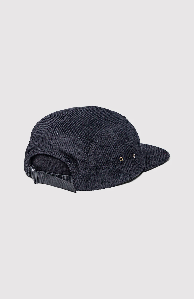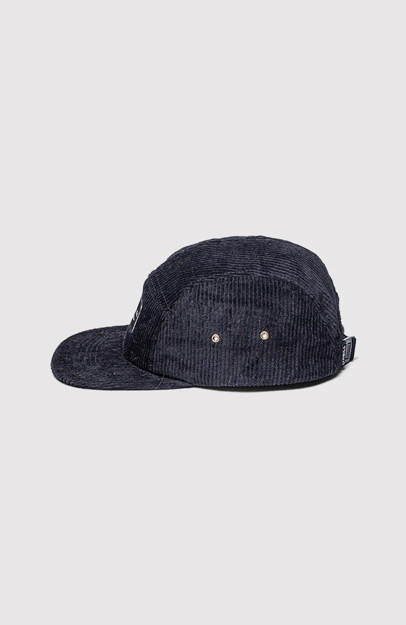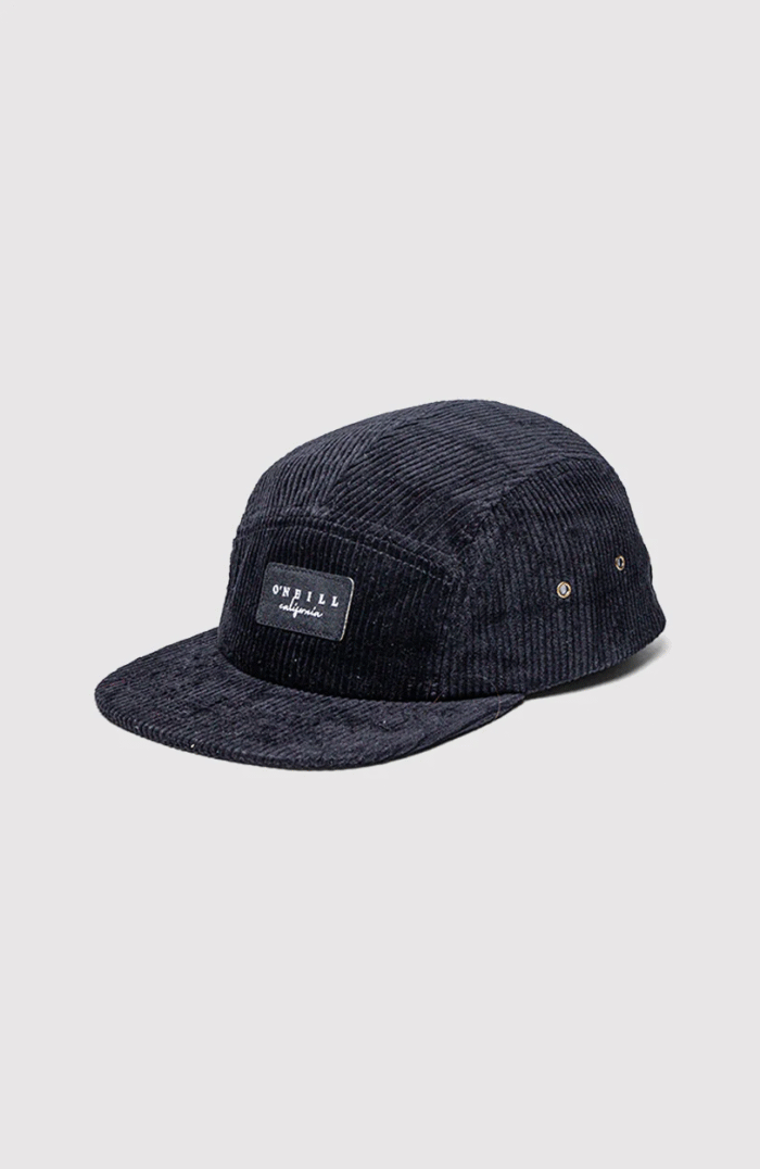 Gorra cinco paneles confeccionada en tela corderoy color negro. Cuenta con visera plana, ojales metálicos laterales para mayor ventilación y un parche frontal con el logo O’Neill California.