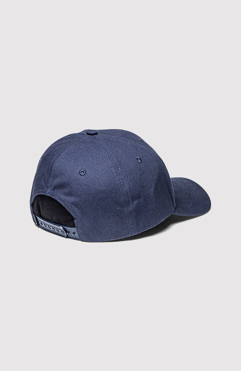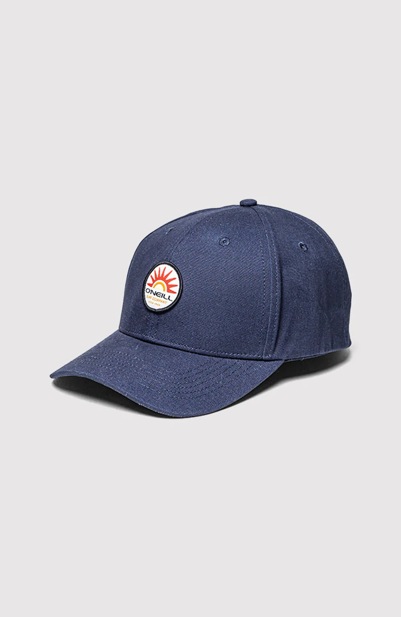 Gorra clásica de seis paneles en colores azul marino y negro, confeccionada en algodón. Presenta una visera curva, ojales bordados para ventilación y cierre ajustable en la parte trasera. En el frente destaca un parche bordado con diseño de sol y el logo de O’Neill.